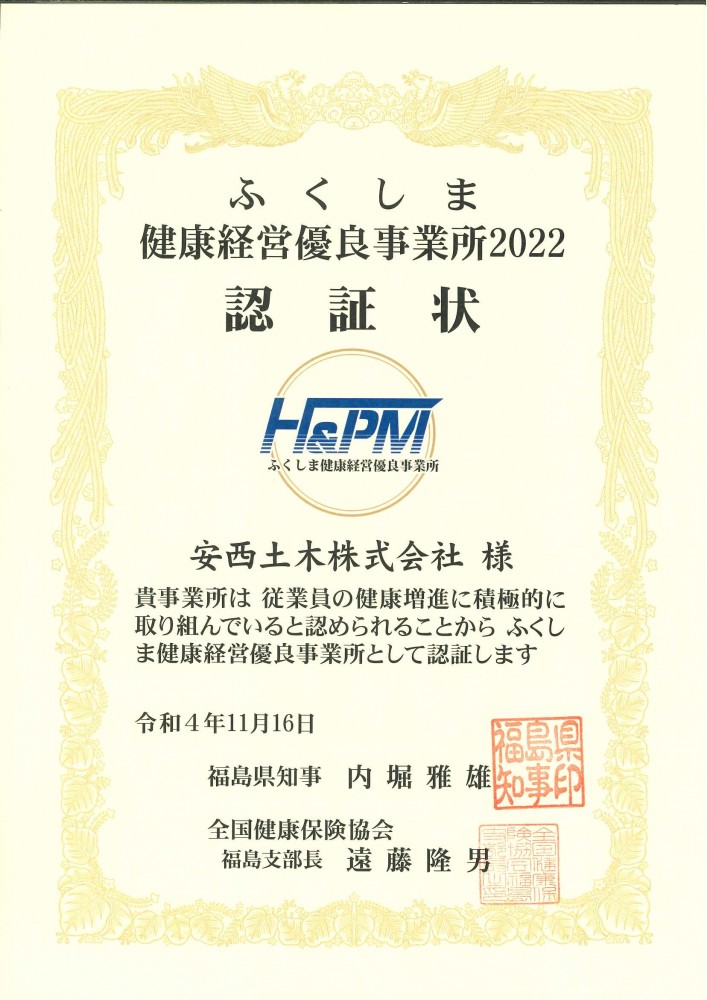 従業員の健康増進に積極的に取り組んでいることが認められ、【ふくしま健康経営優良事業所2022】として認証されました。